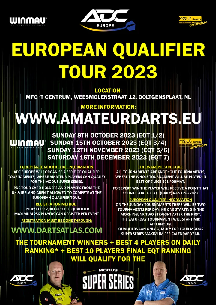 ADC Europe zal in deze toernooien in MFC ’t Centrum te Ooltgensplaat organiseren. Voor het scoringssysteem en toernooisysteem zal het Darts Atlas systeem gebruikt worden en dient men ook via deze site in te schrijven. Er zullen dan ook naast de dartborden geen schrijfborden gebruikt worden, maar tablets die gelinkt zijn met Darts Atlas.