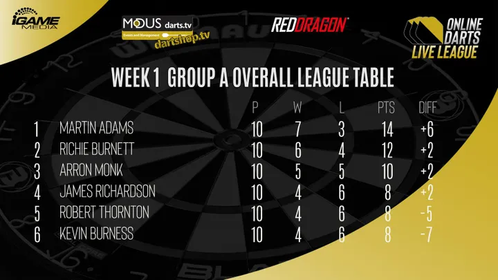 Adams pakte dinsdag enkel de winst tegen Arron Monk (4-3) en Kevin Burness (4-0), terwijl Burnett zeges boekte op Burness (4-3), Adams (4-3), Robert Thornton (4-1) en James Richardson (4-3). Burnett staat met twaalf punten twee punten achter op Adams, terwijl Monk met tien punten ook nog een kleine kans maakt op de poulewinst.