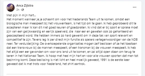 Ter verduidelijking: De overkoepelende organisaties mogen zelf beslissen of ze het toestaan dat een transvrouw bij de mannen meespeelt, of een transman bij de vrouwen meespeelt. Ik heb het altijd een eer gevonden om voor ons land uit te komen, en zal altijd open staan om terug te keren in het nationaal team. Ik hoop met heel mijn hart en voor alle vrouwensporten dat men tot bezinning komt. Deze beslissing is niet licht en heel moeilijk geweest, 1991 is de eerste keer geweest dat ik met trots voor Nederland, het shirt aantrok'', schrijft Zijlstra.