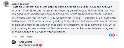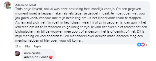 In een reactie op dit bericht liet De Graaf ook weten uit het team te stappen. ''Trots op je lieverd, ook al was deze beslissing heel moeilijk voor je. Op een gegeven moment moet je keuzes maken als iets tegen je gevoel in gaat. Je moet doen wat voor jou goed voelt. Vandaar ook mijn beslissing om uit het Nederlands team te stappen. Als iemand zich niet fijn voelt in het lichaam waar hij of zij in geboren is, dan gun ik het iedereen om dit te veranderen en gelukkig te zijn. Ik vind het alleen niet terecht dat een biologische man bij de vrouwen mee gooit of andersom, het is of gemixt of niet. Dit is mijn mening en veel anderen zullen hier anders over denken maar iedereen mag een mening hebben of hier open voor uit komen'', zo reageert De Graaf.