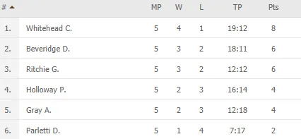 The Barbarian is deze poule begonnen met vier overwinningen in vijf duels. Whitehead verloor van Greg Ritchie (4-3), maar won wel van Darren Beveridge (4-3), Dave Parletti (4-1), Paul Holloway (4-2) en Adrian Gray (4-2).
