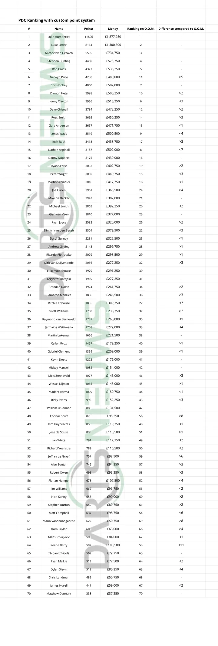 Luke Littler vrijwel gelijk blijft bij een overgang naar dit puntensysteem. Littler heeft 30,72 procent minder ranking-prijzengeld gewonnen dan Humphries, terwijl het verschil in punten 30,85 procent is. Dat verschil is dus verwaarloosbaar.