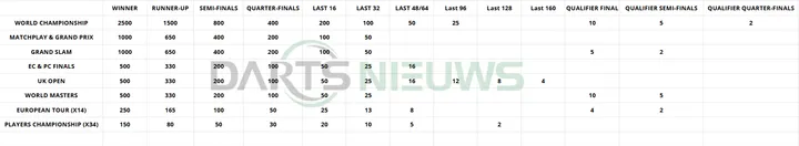 In het onderstaande overzicht is de verdeling van het aantal punten per toernooi in beeld gebracht. Naast het toekennen van punten aan spelers die in de eindfase van qualifiers verliezen, is een ander groot verschil de status van het WK Darts. De wereldkampioen krijgt volgens dit systeem 2500 punten, evenveel als het winnen van de World Matchplay, World Grand Prix en de UK Open. Vanaf de komende editie van het wereldkampioenschap ontvangt de wereldkampioen een bedrag van één miljoen pond. Een andere speler moet de World Matchplay, Grand Slam of Darts, World Grand Prix, Players Championship Finals en de European Championship allemaal winnen om aan dat zelfde bedrag te komen. Naar mijn mening is de puntenopzet een eerlijkere verhouding.