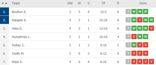 De tweede plek is momenteel in handen van Ratajski, die wel al vier wedstrijden speelde. Hij verloor van Heta, maar zegevierde tegen Dobey, Smith en Steve West.