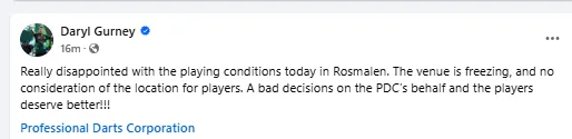 "Ik ben echt teleurgesteld in de speelomstandigheden vandaag in Rosmalen. De locatie is ijskoud en er is totaal geen rekening gehouden met de spelers. Een slechte beslissing van de PDC en de spelers verdienen beter!!!"