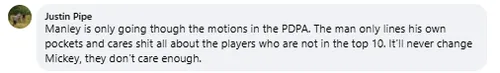 "Peter Manley doet alleen maar alsof hij iets voor de PDPA doet. Die man vult alleen zijn eigen zakken en geeft helemaal niks om de spelers die niet in de top 10 staan. Het zal nooit veranderen, Mickey, ze geven er gewoon niet genoeg om."