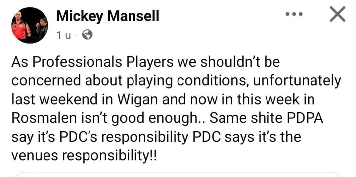 Daarnaast kaartte Mansell de verhouding tussen de PDC (Professional Darts Corporation) en de PDPA (Professional Darts Players Association) aan, die volgens Mansell de verantwoordelijkheid wegschuiven. "Het is steeds hetzelfde gedoe. De PDPA zegt dat het de verantwoordelijkheid van de PDC is, en de PDC schuift het af op de locatie. Dat helpt ons spelers totaal niet verder."