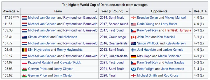 Liefst zes van de tien hoogste teamgemiddeldes op het WK voor landenteams staan op naam van Van Gerwen en Van Barneveld. De drie hoogste gemiddeldes worden alle drie bezet door Nederland, waarvan er één een officieus wereldrecord is.