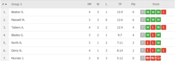 Beaton begon de competitie met een 3-4 nederlaag tegen Richard North, maar herstelde zich daarna met zeges op Gary Blades (4-1), Nathan Derry (4-2) en Joe Murnan (4-2). Later op de dag speelt de Engelsman nog tegen Alan Tabern en Mickey Mansell.
