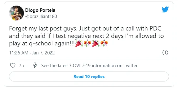 Enkele ogenblikken na zijn bericht werd de Braziliaanse darter echter gebeld door de PDC. ''Vergeet mijn laatste bericht. De PDC heeft gebeld en gezegd dat wanneer ik de komende twee dagen negatief test, ik alsnog mag meedoen'', aldus een blije Portela.