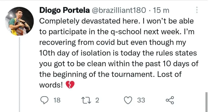 ''Helemaal kapot van verdriet. Ik kan niet meedoen aan de Q-School komende week'', schreef Braziliant in een inmiddels verwijderde tweet. ''Ik ben herstellende van een besmetting. Ondanks dat ik vandaag op de tiende dag van mijn zelfisolatie zit, staat er in de regels dat je tien dagen voorafgaand aan het toernooi 'schoon' moet zijn. Ik heb hier geen woorden voor.''