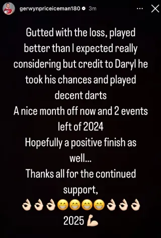 Dat maakte hij bekend nadat hij donderdagavond in de eerste ronde van het EK Darts verloor van Daryl Gurney. ''Teleurgesteld met het verlies, maar ik heb beter gespeeld dan van tevoren verwacht. Felicitaties aan Daryl, die zijn kansen pakte en prima speelde. Ik neem nu een maand vrij en heb nog twee toernooien te gaan in 2024. Hopelijk kan ik positief afsluiten'', zo schreef Price.