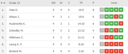 Huybrechts deelt momenteel de tweede plek met Wilson, na ieder drie overwinningen en een nederlaag. Schindler en Wilkinson staan allebei op vier punten, terwijl Leung en Borland al hun vier openingsduels verloren.