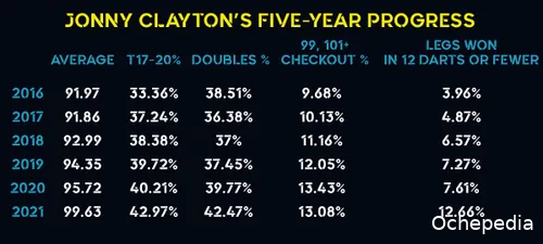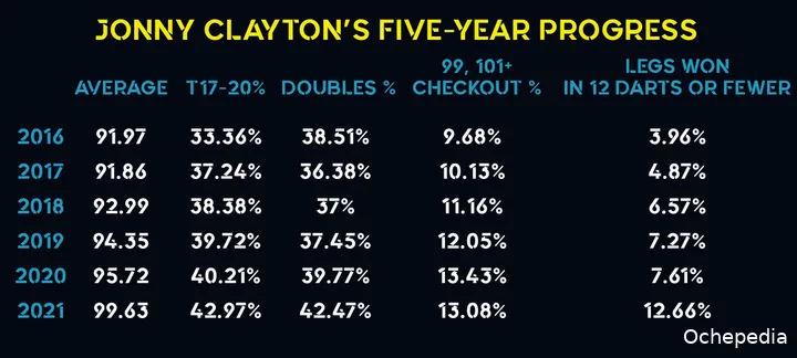 De statistieken van Clayton laten ook zien dat hij zich bijna elk jaar heeft verbeterd. Zo gooide Clayton in 2016 in slechts 4 procent van zijn gewonnen legs een 12-darter of beter, tegenwoordig wint hij 12.66 procent van zijn gewonnen legs in twaalf pijlen of minder.