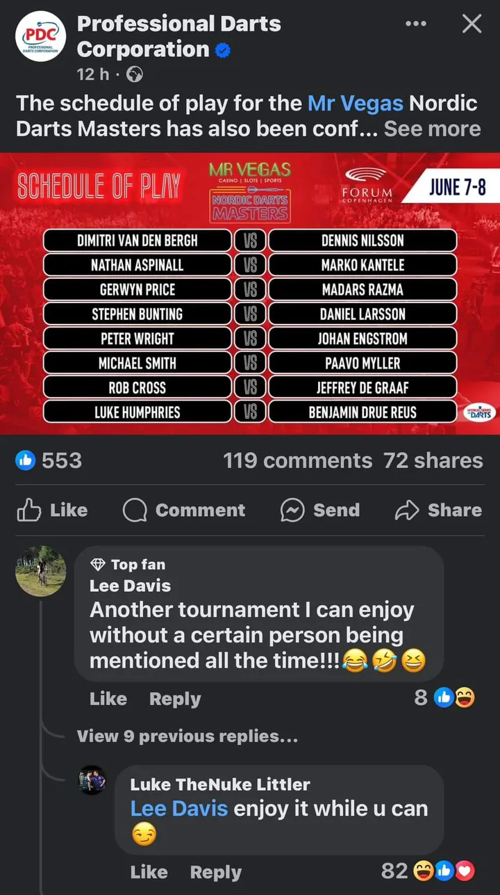 De PDC plaatste dinsdag het speelschema voor de openingsdag van de Nordic Darts Masters. Tot geluk van een fan genaamd Lee Davis stond Littler daar dus niet op. ''Weer een toernooi waar ik van kan genieten zonder dat een specifiek persoon de hele tijd genoemd wordt'', schreef hij met een aantal lach-emoji's.