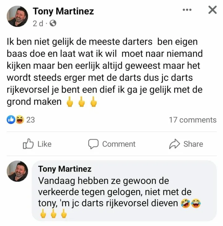 ''Een bende dieven'', zo betitelde Martinez de organisatie van het toernooi. Het toernooi werd georganiseerd door JC Darts. "Het wordt steeds erger met de darts dus jc darts Rijkevorsel je bent een dief ik ga je gelijk met de grond maken", schreef Martinez.
