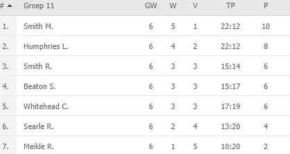 De tweede plek was voor Humphries met vier zeges uit zes duels. Ross Smith, Beaton en Whitehead kwamen alle drie tot drie overwinningen.