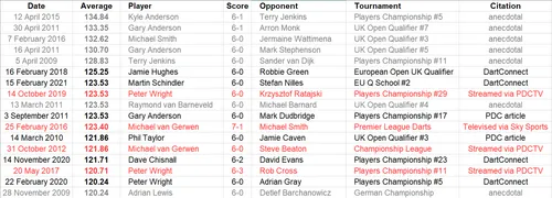 Op de all-time lijst is dat moyenne slechts genoeg voor een elfde plaats. De lijst wordt aangevoerd door Kyle Anderson, die in 2015 een wedstrijd tegen Terry Jenkins met 134.84 gemiddeld wist te winnen. De Australiër noteerde in deze weergaloze partij drie 10-darters, een 11-darter, 12-darter en een 15-darter.