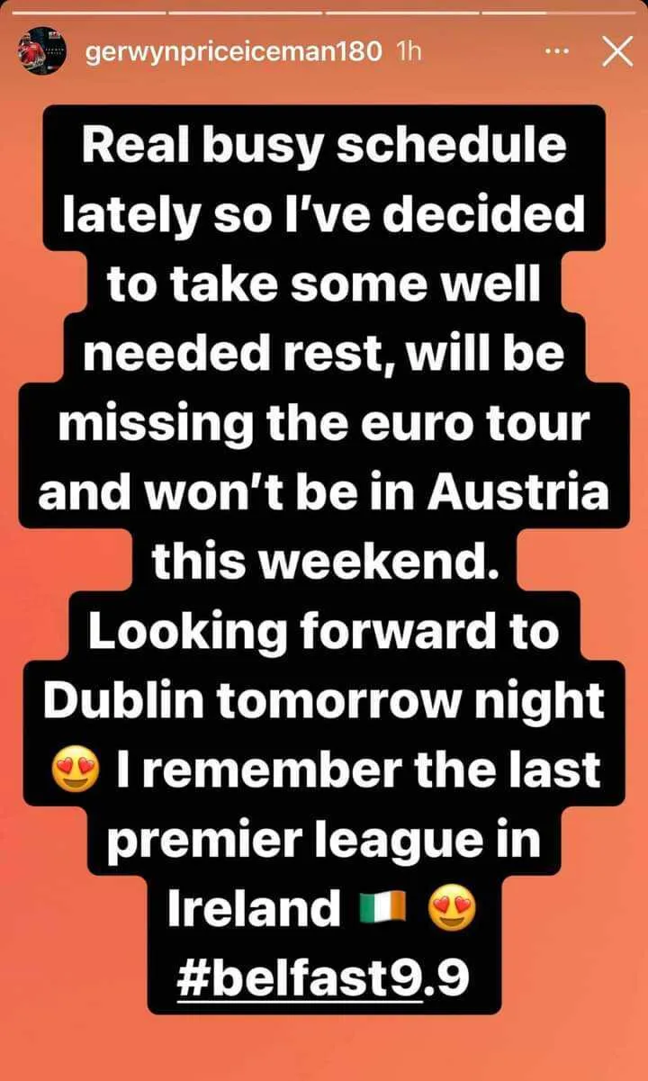 In het Oostenrijkse Graz wordt het vierde Euro Tour-toernooi van het seizoen gespeeld. Price kiest er echter voor om rust te nemen.