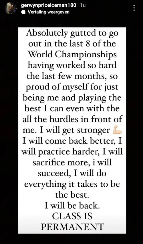 Price kwam later nog met een uitgebreidere reactie. ''Enorm teleurgesteld om bij de laatste acht te verliezen op het WK Darts. Ik heb de afgelopen maanden enorm hard gewerkt. Trots dat ik mezelf kan zijn en het beste uit mezelf haal, ondanks alle obstakels die mij opgeworpen worden. Ik ga sterker terugkomen, harder trainen, meer toewijding tonen en nog meer succes behalen. Ik ga alles doen om de beste te worden. Ik kom terug, klasse is permanent'', zo besloot de uittredend wereldkampioen.