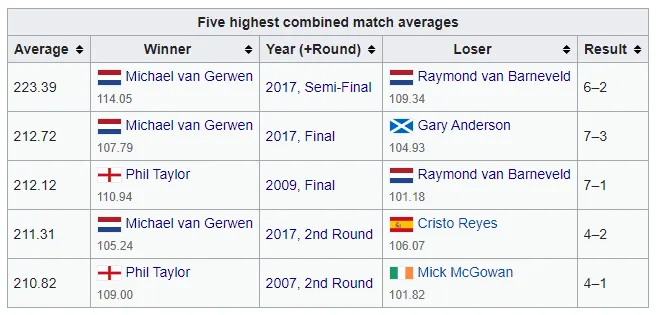 Dat was nipt hoger dan die van de WK-finale uit 2009, toen de teller op 212.12 eindigde. Phil Taylor produceerde toen een moyenne van 110.94, terwijl Van Barneveld destijds 101.18 gemiddeld gooide. Het vierde hoogste gecombineerde wedstrijdgemiddelde staat op naam van Van Gerwen (105.24) en Cristo Reyes (106.07). De Nederlander en de Spanjaard gooiden een gecombineerd gemiddelde van 211.31. De top vijf wordt afgesloten door Taylor (109.00) en Mick McGowan (101.82) met 210.82.