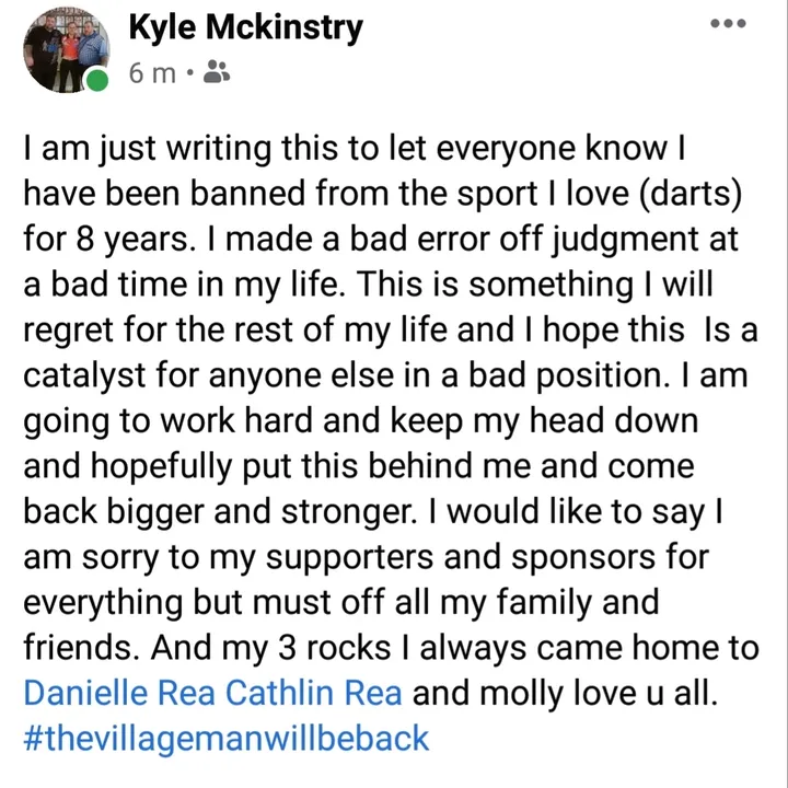 DRA de uitspraak nog niet heeft bevestigd, maakt McKinstry zijn schorsing wereldkundig op Facebook. ''Ik schrijf dit om iedereen te laten weten dat ik voor acht jaar ben verbannen van de sport waar ik van houd'', schrijft de voormalig Lakeside-deelnemer.