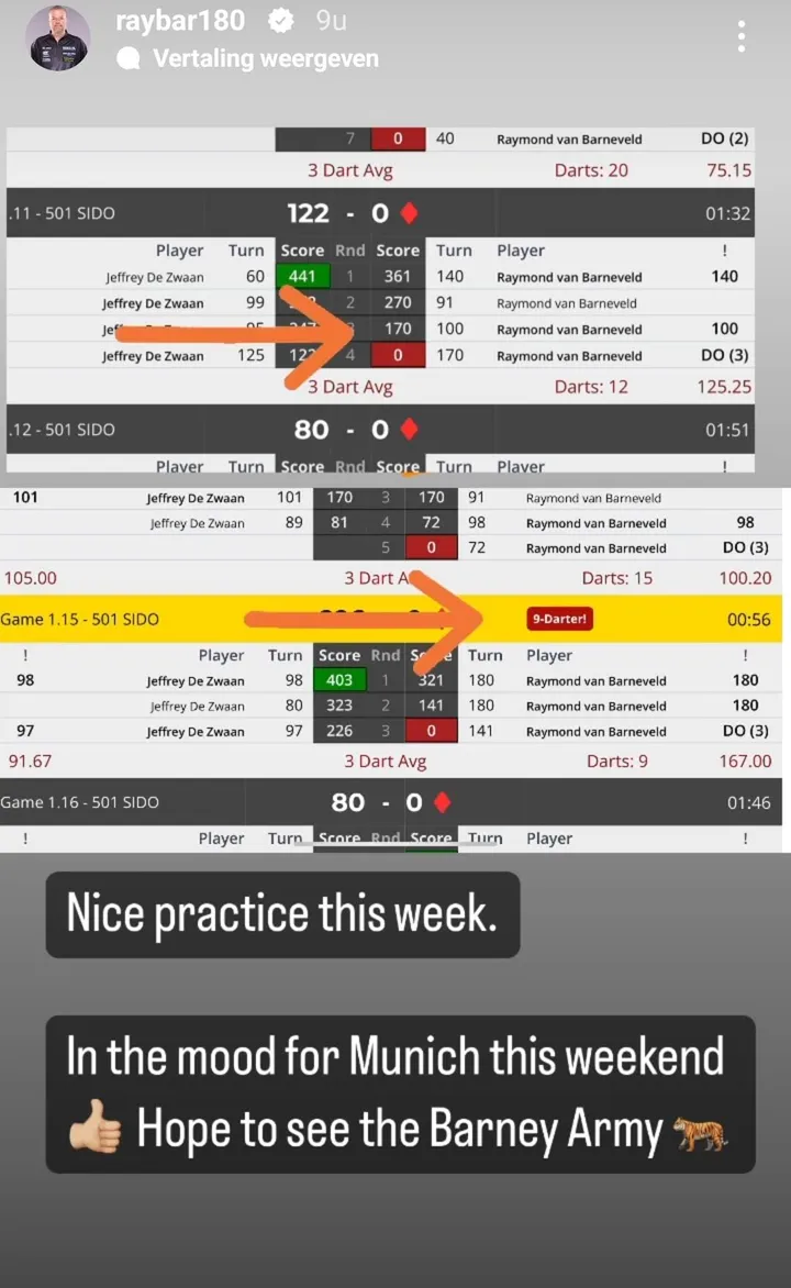 Raymond van Barneveld steekt al enige tijd goed in zijn vel, en ook op de trainingen loopt het lekker zo bleek uit een serie screenshots die Barney plaatste op zijn Instagram.