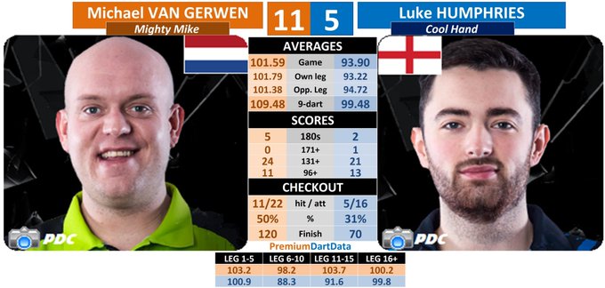 De Nederlander nam hiermee revanche op Humphries, die eerder in november op de Grand Slam of Darts nog met 16-10 had gewonnen van Van Gerwen. Voor 'Mighty Mike' wordt het zijn achtste finale op de