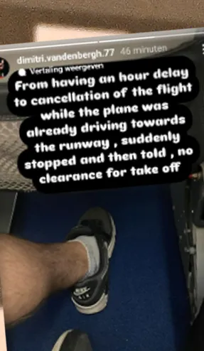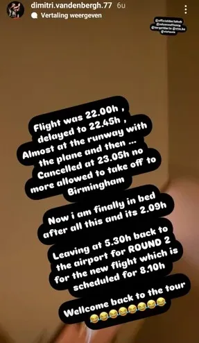 Die reis naar Engeland liep echter niet volgens plan. Via Instagram liet Van den Bergh weten dat zijn vlucht richting Birmingham op het laatste moment werd geannuleerd. “Van een uur vertraging tot annulering van de vlucht richting Birmingham”, schreef hij. “En dat terwijl het vliegtuig al naar de startbaan reed. Toen het plotseling stopte, kregen we te horen dat er geen toestemming was om op te stijgen.”