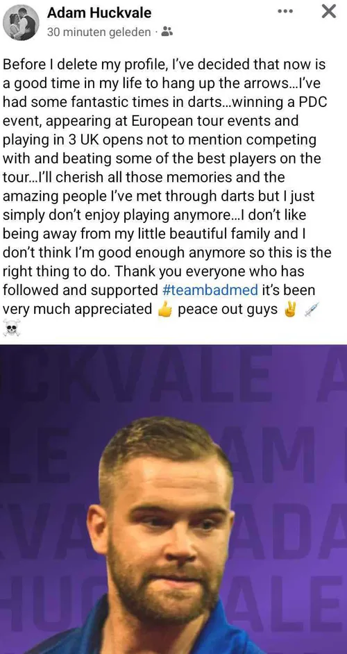 Adam Huckvale heeft zijn pijlen definitief aan de wilgen gehangen, zo maakte hij bekend op Facebook. 'The Medicine' wist in 2018 een toernooi op de PDC Challenge Tour te winnen en deed driemaal mee aan de UK Open.