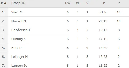 Verdeeld over achttien speeldagen komen tot en met 10 december 42 verschillende spelers in actie. De zeven beste spelers spelen op vrijdag 11 december in de finalegroep.
