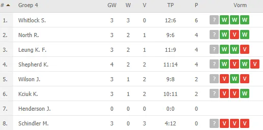 North, Leung en Shepherd staan voorlopig op twee overwinningen. Schindler verloor zijn eerste drie duels. Wilson en Kciuk boekten tot dusver één winstpartij.