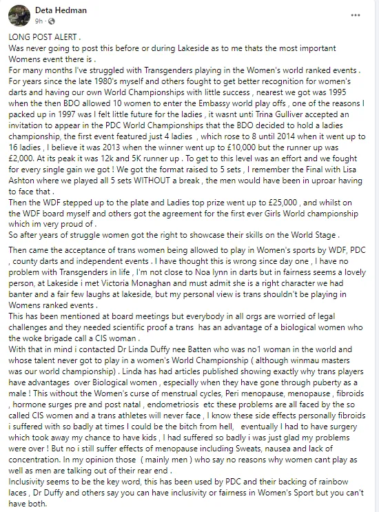''Ik vind dit al sinds dag één verkeerd'', stelt Hedman. ''In het dagelijkse leven heb ik geen problemen met transgenders. Op dartsgebied ben ik niet zo close met Noa-Lynn, maar eerlijk gezegd lijkt ze me een aardig persoon. Op Lakeside ontmoette ik Victoria Monaghan en ik moet toegeven dat ze een goed karakter heeft. Maar mijn persoonlijke mening is dat transgenders niet zouden moeten kunnen deelnemen aan damestoernooien.''