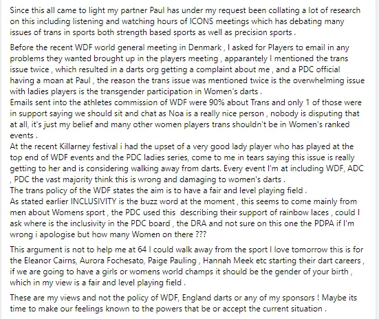 Volgens bronnen, waarvan de namen bekend zijn bij de redactie, had onder meer Deta Hedman de onvrede over de deelname van transgenders aangekaart bij het bestuur van de World Darts Federation (WDF). Voorafgaand aan de publicatie van het artikel is er contact opgenomen met Paul James, man en belangenbehartiger van de 64-jarige Engelse. De bovengenoemde informatie werd in een reactie afgedaan als 'onzin en feitelijk onjuist' en bovendien werd er gedreigd met advocaten indien er een publicatie zou plaatsvinden. Uit het statement van Hedman dat dinsdag is gepubliceerd, blijkt het verhaal ondanks een eerdere ontkenning wel degelijk te kloppen.